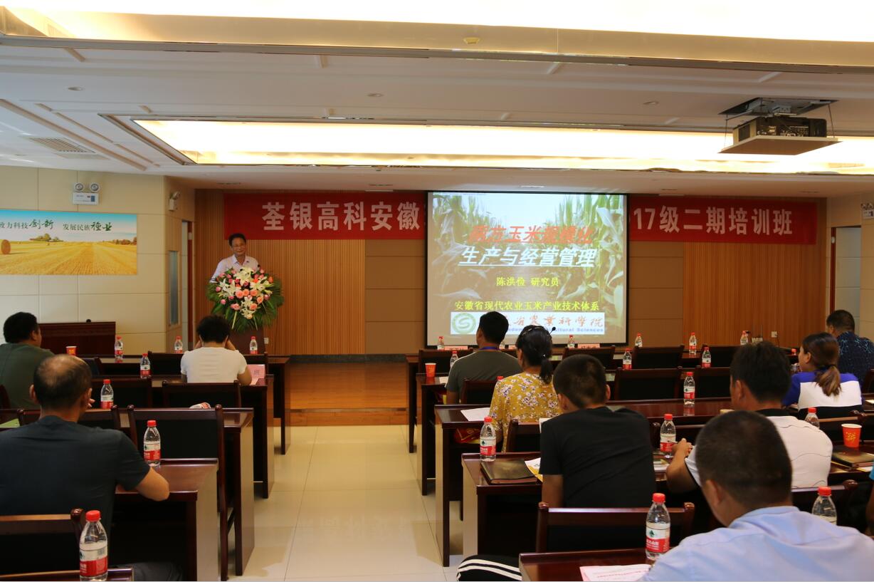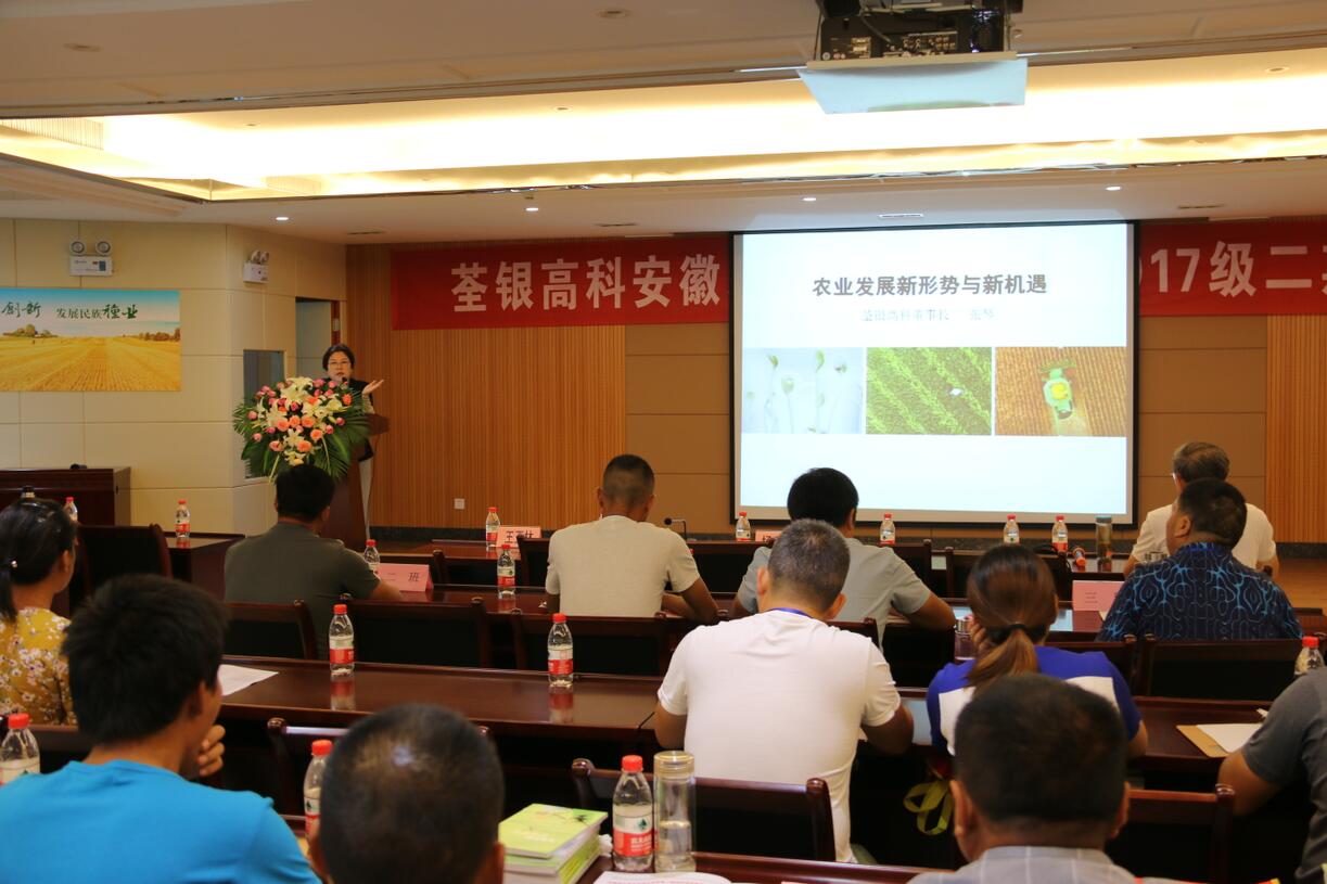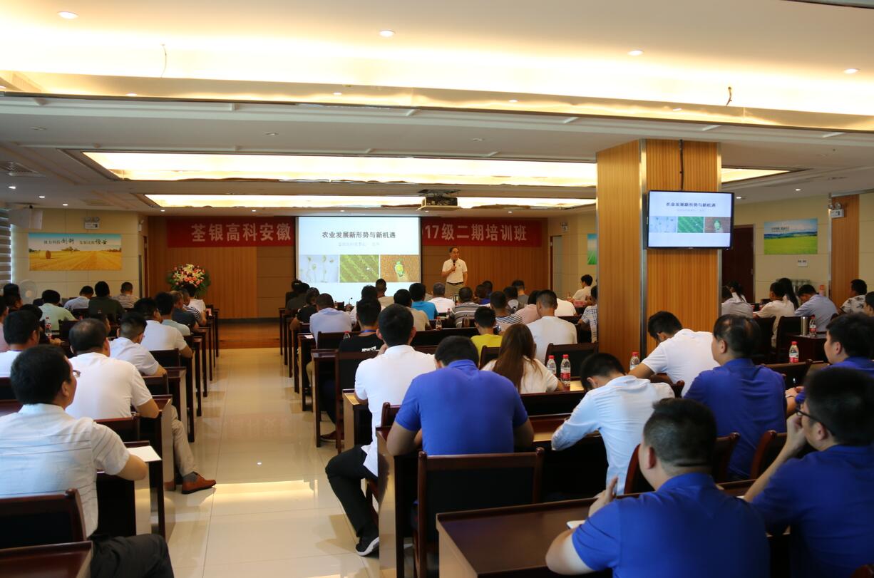 ??? 2018年7月19日,由安徽省農委主辦、荃銀高科承辦的安徽現代青年農場主培訓2017級第二期培訓活動在公司六樓多功能廳展開。安徽荃銀高科董事長張琴、營銷總監(jiān)王玉林,培訓班總教務長楊惠成老師,安徽張海銀基金會秘書長張彤,及來自全省各地的100多位從事種植業(yè)的農場主學員參加了培訓。