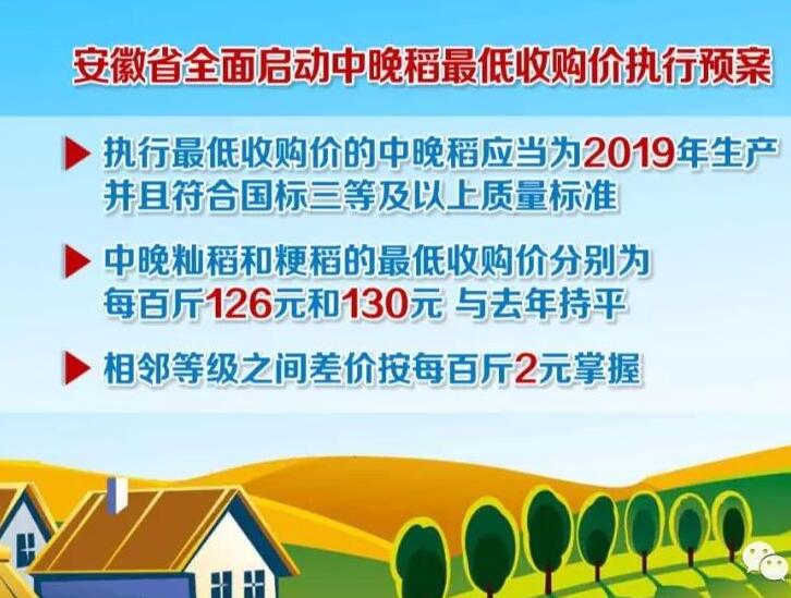 ??? 近日,從省政府新聞辦舉行的新聞發布會上了解到,從現在開始到2020年1月31號,安徽省全面啟動中晚稻最低收購價執行預案,執行最低收購價的中晚稻應當為2019年生產并且符合國標三等及以上質量標準,中晚秈稻和粳稻的最低收購價分別為每百斤126元和130元,與去年持平,相鄰等級之間差價按每百斤2元掌握。